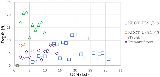 Measured unconfined compressive strength (UCS) triaxial test results of the caliche cores.