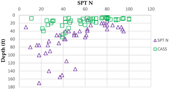 Samples were acquired by modified California split spoon (CASS) and standard split spoon (SPT) samplers. Figure 3 shows the measurements of these penetration tests based on the reported borings. Although the CASS and SPT reported scattered measurements, the results show the heterogeneous soil in the project is stiffer up to 40 feet of depth from the ground surface level.