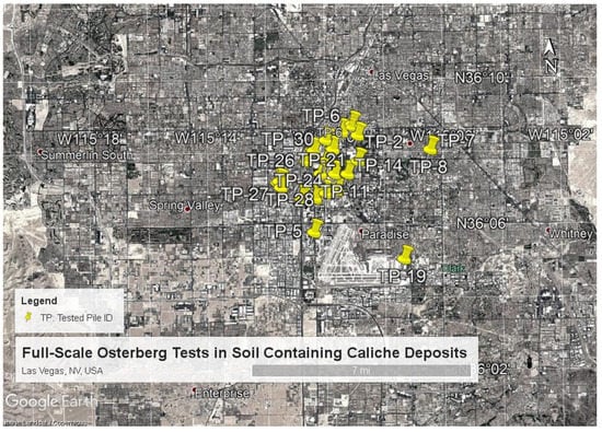 Location of the 30 reported bidirectional Osterberg tests. The full-scale tests were conducted in the presence of highly cemented caliche layers in the soil profile.