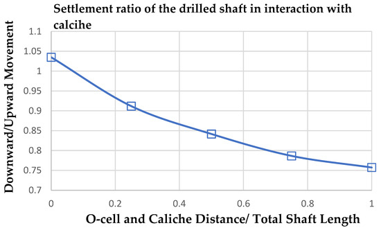 The results of the finite element analysis show that the changes in the location of O-cell along the drilled shaft length with respect to the caliche layer affects the interpretation of the test results. The ratio of the downward to upward movement of the pile subjected to the bidirectional test was calculated. As shown in Figure 6, increasing the distance between the location of the O-cell apparatus and the caliche layer reduces the downward to the upward settlement ratio of the drilled shaft. The caliche layer is not mobilized to the maximum of its capacity if the O-cell is installed far from the caliche. This can be reasoned due to the dissipation of the applied load by the O-cell through the soil layers, as a small portion of the load from high depths reaches the caliche layer, which exists close to the ground surface level. During the upward loading by the O-cell, the mobilization of the caliche layer is more considerable, compared to the downward load application and produces higher resistance values for the specified pile settlements. Based on the analysis, if the O-cell is located to the nearest possible existing competent caliche deposit, the outcomes of top-down and bidirectional Osterberg tests are comparable.