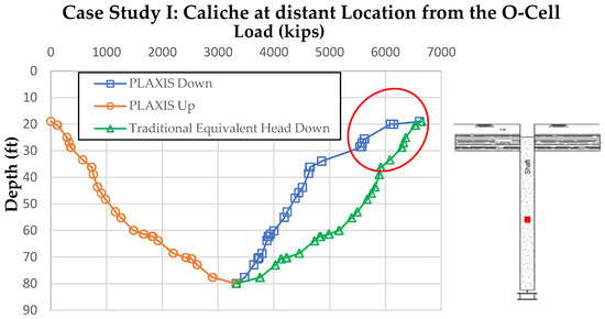 The effect of the O-cell location with respect to competent caliche layers was investigated. In Case Study I, the O-cell was installed far from the caliche layer, whereas, in the second scenario (Case Study II), the O-cell was installed close to a strong caliche layer. It can be perceived from the results that the caliche is not fully mobilized when the load cell is located very far from it. The load is dissipated through the soil layers before transferring to the caliche layer, and only a slight portion of the load was reached to mobilize the caliche. Hence, the resistance developed from the caliche was the reaction of this deposit to a small portion of the total applied load. The mobilization did not fully represent the caliche’s capability. The caliche layer subjected to axial loading from the top of the pile mobilized further compared to the downward loading, due to its close distance to the loading source. In this loading condition, higher shear resistance is developed, as shown in Figure 14. This shows the existing caliche layer can carry more loads than the reported measurements based on different directions of the load application.