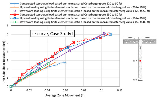 The nonlinear stress–strain responses of the drilled shafts in the soil containing caliche layers were also investigated using t–z stiffness curves. In this regard, t–z curves were used to analyze the results of the calibrated upward and downward loading components of the Osterberg test as finite element models, and compare them to the theoretical top-down loading, which was constructed based on the measured values reported by the field Osterberg test. Figure 8 illustrates the t–z curves following the displacements recorded by the installed strain gauges between 20 and 50 feet, along with the gauges installed within 50 and 80 feet. The O-cell was installed at the depth of 80 feet.
