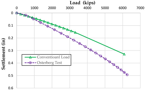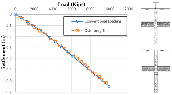 Seo et al. [33] evaluated the available data that might allow direct comparisons between the Osterberg and conventional top-down loading tests on drilled shafts. Based on this evaluation, the differences in rock socket response between Osterberg and top-load tests are due to the modulus of the rock mass at very high slenderness ratios and interface friction angles. The study suggested that the equivalent top-load–settlement curve derived from an Osterberg load test under predicts side resistance for higher displacements.