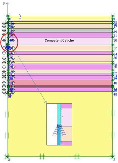 The general design procedure for drilled shaft foundations in soils is primarily based on the ultimate values of drilled shaft skin friction and end bearing capacity [1]. The basic load transfer mechanisms were identified through early research on drilled shafts [2,3]. This method is appropriate for soils in conventional geological settings in the absence of highly cemented caliche deposits. Caliche is the hard lithification of fine-grained sediments, along with sand and gravel layers, which form through secondary cementation by calcium and magnesium carbonate [4,5]. The federal highway code of design [6] considers caliche a sedimentary rock in the design procedure of deep foundations. Therefore, the design parameters of drilled shafts in interaction with rocks are recommended for the interaction of drilled shafts and caliche deposits. The shaft/caliche bond is considerably strong [7] and can bear high-range loading conditions. Caliche layers are usually underlain by weak soils. The bending of the caliche deposits as part of the caliche-pile monolithic system is due to the additional flexural strength of these deposits in the soil profile [8].