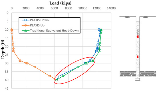 Finite element (FEM) analysis was conducted following the results of two case study projects. The prime objectives were to study the behavior of drilled shafts under bidirectional loads, compare results with the field results, and investigate force/stress distributions along the shaft’s length in soil containing caliche layers. Results of the test were verified following Osterberg’s main assumptions [47,48]. He assumed the shaft resistance–movement curve for upward movement of the pile is the same as the downward side-movement component of a conventional top-down test.