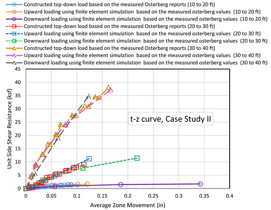 Similar to the previous case study, the t–z curves from the calibrated finite element model are compared to theoretical top-down loading. Figure 12 shows t–z curves according to the displacements in three depth ranges, 10–20 feet, 20–30 feet and 30–40 feet. The load–settlement pattern in the simulation and top-down test were comparable. The slight changes in the pattern can be justified due to the mobilization of geomaterial close to the ground level during the test applications. However, such a mobilization does not contribute to enhancing the ultimate load-bearing capacity. In the analysis, the results of the calibrated finite element model agree well with the outcome of the Osterberg test. The results show that when the O-cell is placed close to the caliche layer, the difference between upward and downward loading is the least.
