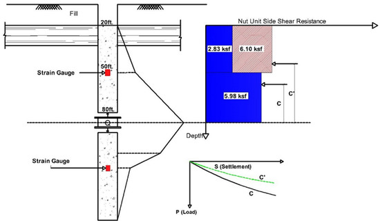In Case Study II, other soil layers above caliche were partially developed to their failure capacity. During the upward load application, excessive movement between the soil layers and caliche deposit was recorded; however, an additional side resistance was not developed. The transferred load distribution, based on the load application by the top-down test in the caliche, was comparable to the Osterberg test results. Due to negligible changes in the side resistance based on the different loading directions, the C value remained constant. Subsequently, the load–settlement diagram for the test drilled shaft is similar for both loading directions, as presented in Figure 16.