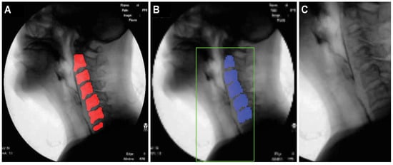 As seen from the area inside the green box in the fluoroscopic image presented in Figure 1, since the boluses that provide evidence of airway invasion are always found in front of the cervical spine, in the proposed method, the larynx and its adjacent area are selected as the ROI for effective airway invasion detection. However, since the head and neck move every time a patient swallows while participating in the VFSS procedure, rather than fixing the ROI to a specific area of the image, it is necessary to create a so-called dynamic ROI that adaptively moves in accordance with the patient’s movement. To this end, in the proposed method, a cervical spinal column showing large and structurally prominent features is found for each fluoroscopic image and used as a reference point for defining the ROI.