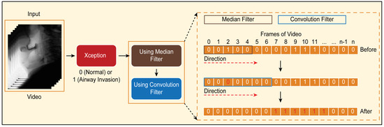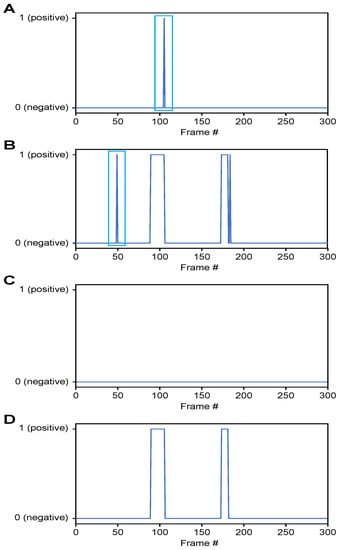 Figure 6. Classification results for airway invasion using the Xception module-based CNN: (A) results for a person with normal swallowing, (B) results for a patient, (C) results for a person with normal swallowing after correction using a median filter, and (D) results for a patient after correction using a median filter.Based on the classification results for the individual image frames as shown in Figure 6, we can finally determine whether airway invasion occurred in a particular video of a subject participating in the VFSS. Since the bolus-swallowing motion is a continuous motion, the images acquired during a true instance of airway invasion should be classified as positive samples continuously along the time axis. To capture the temporal context of each video in the final decision on whether airway invasion has occurred, we applied two types of filters, namely a median filter [29] and a convolution filter, to the classification results for the individual images, as shown in Figure 6.First, since the video files we used were recorded at 24 fps, it is reasonable to regard positive samples generated in the form of intermittent impulses, as indicated by the blue boxes in Figure 6A,B, as false positives. Therefore, we chose to correct the classification results for such samples to negative results using a median filter with a length of 5. From a similar perspective, we determined that airway invasion can be considered to have occurred only when two or more of the classification results for seven consecutive image frames are classified as positive samples. Formally, let the vector contain the classification results (Figure 6) for all image frames of a video composed of l frames. We consider that airway invasion has occurred only when the following is two or more:Here, is a convolution filter of length 7 with a value of 1 for all components (Figure 7).