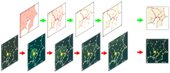 The microorganism called slime mold [13] has an evolutionary history of 100 million years. It can eventually find a high-quality foraging path by avoiding external obstacles in a network structure. The unique and efficient foraging process provides a new inspiration for path optimization. Therefore, scientists learned from the intelligent life and obtained a new algorithm called Slime Mold Algorithm (SMA) [14]. With the unique searching ability, slime molds can efficiently find a high-quality way to the food in maze experiments. As shown in Figure 1, based on the slime mold’s foraging behavior, the scientists thought of the food sources as the cities of a country. It was found that the foraging path network of slime molds is highly similar to the actual road network designed in the country [15,16,17,18]. Thus, foraging behavior of slime mold has great significance to be explored for path optimization [19,20,21,22,23].