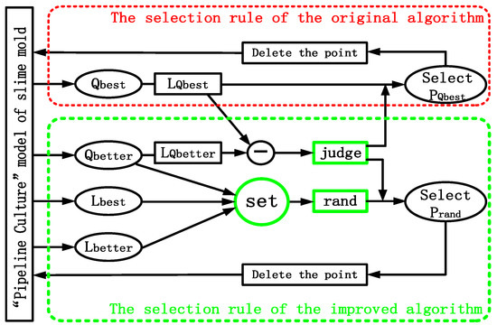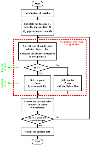 Due to the short development time, the research depth of SMA is insufficient and many details of the model have to be explored. As far as the “pipeline cultivation” model of SMA, the path point selection is only based on the flow value, and there is only one path to be obtained, so it makes the optimization results limited. Moreover, SMA cannot jump out of the local optimum, especially in the complex situation of points. Therefore, TPSMA is designed by using two-way parallel optimization on flow and distance in this paper. As shown in Figure 3, it uses two reference indicators of flow and distance to search for next point, instead of the original principle, which is selecting the next point only by flow. At the same time, a random factor is added when points are selected by the flow and distance, to increase the diversity of result.