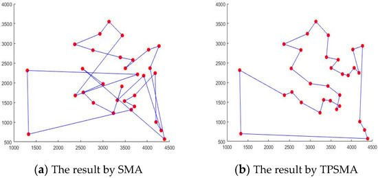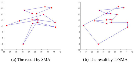 We selected four datasets of TSP in TSPLIB; ulysses16, city31, eil51, gr96, and bier127. Of these, city31 is the data set of longitude and latitude coordinates of the locations of 31 cities in China. Multiple sets of data are selected to ensure the reliability of the conclusions. At the same time, the number of the four groups of datasets is 16, 31, 51, 96, and 127, separately and increasing in order. It increases the difficulty of optimization and fully verifies the performance of the algorithm. Figure 5, Figure 6, Figure 7, Figure 8 and Figure 9 are the simulation results obtained about five groups of TSP data by SMA and TPSMA. It can be seen from the figures that the results under the five groups of data are obviously improved by TPSMA.