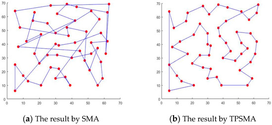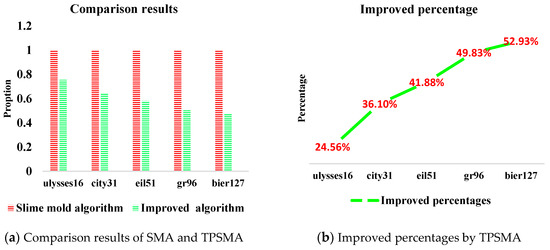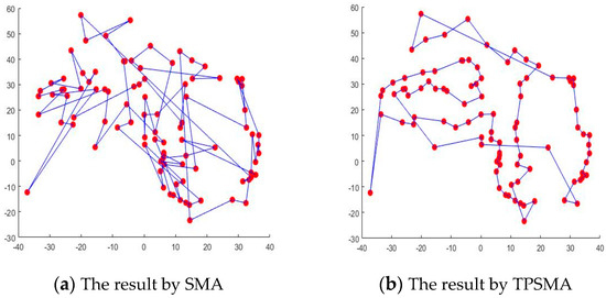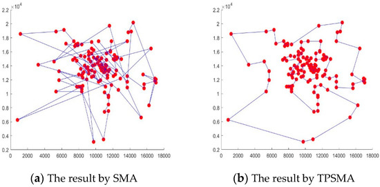 Secondly, as per the experimental results also shown in Figure 13b, the improved percentages of TPSMA are gradually increased with the increasing number of points. It can be seen that TPSMA designed in this paper is more powerful in solving TSP with large points and complex distribution. Thus, the experimental results fully verify the rationality and superiority of TPSMA.