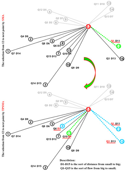 Taking ulysses16 data as an example, the optimization ability of TPSMA is verified by analyzing the optimization process. Figure 5 and Table 2 are simulations and partially obtained paths under ulysses16 data. In the tables, red represents the current point and optimal result, green represents the selected point by SMA and TPSMA, and blue represents the remaining points in the set of candidate points by TPSMA. Figure 10 shows the flow and distance values from path point 12 to the remaining path points, and their ranking of each point.