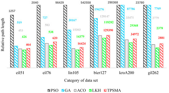 Based on some sets that have large points in TSPLIB, we can obtain the following by experiment. Table 5 is the results of each heuristic and bionic algorithm under different data sets. From the experimental results in Figure 14, the TPSMA results are obviously better than GA and PSO, and similar to ACO. Since the initial pheromone distribution of ACO is unpredictable, the reasonable distribution of pheromones needs to be gradually formed by iteration. Therefore, the convergence speed is very slow. Although TPSMA optimization results were slightly worse than ACO, TPSMA optimization speed was significantly better than ACO. Compared with the current best optimization result, which is from LKH, the result of TPSMA is not as good as LKH; however, it is closer to the optimal result than other algorithms. Moreover, LKH is in virtue of the principle which is based on the algorithm. The more task points there are, the more iteration time it will cost, and the convergence performance will be poor.