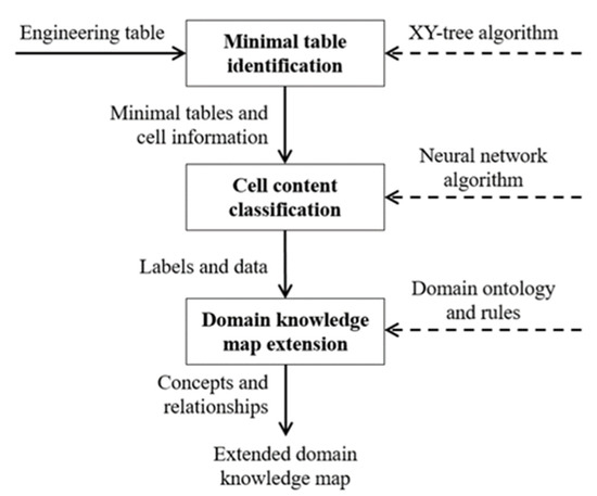 The proposed framework has three steps of table understanding: (1) Identification of minimal table, (2) Classification of cells into labels and data, (3) Extending domain knowledge map. Each step was explained with engineering table examples. The first step was designed to find sub-tables in a complex engineering table. It modified the XY-tree algorithm to find sub-tables in matrix form, which are called minimal tables in the framework. The second step was designed to classify cells into labels and data in a minimal table. Neural network algorithm was adopted for the classification. The third step was designed to build a domain knowledge map by mapping between terms in labels and concepts in an existing knowledge map. Natural language processing was adopted to analysis terms in labels, and language grammar-based rules were proposed for mapping between terms in labels and concepts in the domain knowledge map.