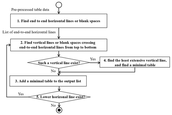 The XY-tree algorithm [21] can make a tree structure of cells in a table. The algorithm utilized geometric information of lines composing the table in order to separate chunks of cells. The algorithm was modified to find sub-tables in a complex table. In addition, a blank space between two texts also gives information to separate cells, the XY-tree algorithm was modified to consider a blank space between two texts. A minimal table is a rectangular table which has a matrix form. The proposed algorithm identifies minimal tables with five steps in Figure 4, which shows a flowchart of the five steps.