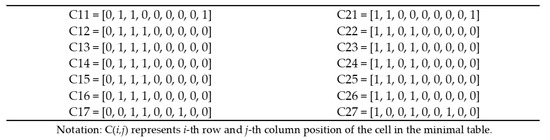 The vectors in Figure 7 illustrate the description of data type and text feature vector for the first minimal table “A” obtained in Figure 5: