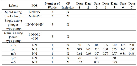 Figure 8 shows a pre-processing result of the table example in Figure 1. Plural term “pumps” is changed to the singular term “pump.” POS tags, the number of words, existence of preposition “of” and existence of related data are captured after pre-processing.