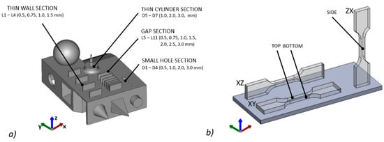 The test sample, the benchmark geometry of which is shown in Figure 1a, was designed to verify the manufacturing limitations of each machine, as well as to aid the comparison of accuracy using industrial computed tomography. The specimen includes basic geometrical shapes such as a cone, sphere, fillets and chamfers, different thin walls, and holes. The mentioned features, due to the layer-by-layer manner of the material addition process, are nontrivial to manufacture. Geometrical shapes can also be measured including the dimensional accuracy, warping, deviations and tolerances, which can be observable due to the difference between the hardware and software of the tested systems.