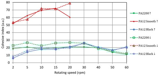 Cohesive index curves recorded as a function of the increasing (↑) and decreasing (↓) rotation speed for polyamide powders.