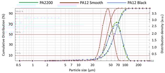 Each tested powder meets the stated requirements. PA2200 and PA12 Black have a similar powder size distribution, as shown in Figure 4, while PA12 Smooth (Sinterit) has a narrower distribution with a smaller central value size, which corresponds with the SEM images. All the tested powders have an insignificant share of particles below 20 µm. In the case of PA12 Smooth, it is worth mentioning the lack of particles smaller than 10 µm. This is in contrast to PA2200 and PA12 Black, where a small size addition could be observed. PA12 Smooth stands out with its smaller particle size and narrower distribution, which can bring about a better final surface quality.