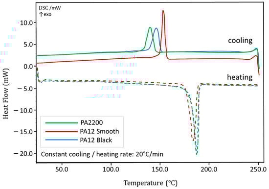 The thermographs, along with the melting and crystallization temperature, were determined. On this basis, the processing temperature ranges of semicrystalline polymers (such as PA12) were determined. The difference between the onset temperatures of melting and crystallization (ΔT = (Tm –Tc)onset) were determined, which is commonly specified as the processing window [].