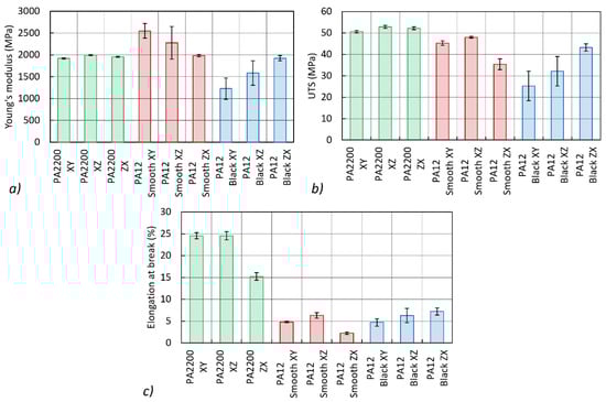 Results of mechanical testing presented as: (a) Young’s modulus, (b) Ultimate Tensile Strength and (c) Elongation at break of the PA2200, PA12 Smooth and PA12 Black with distinction of the build orientation.