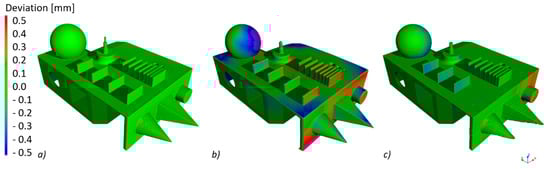 Graphic representation of surface deviation as a result of actual/nominal analysis of (a) PA2200, (b) PA12 Smooth, (c) PA12 Black.