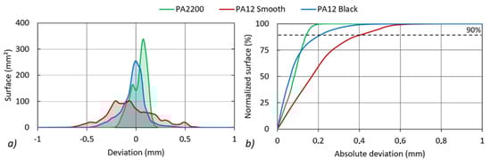 The largest absolute deviations of 0.416 mm were recorded for PA12 Smooth (Lisa). The smallest absolute deviations of 0.143 mm were obtained for the PA2200 sample (Formiga P110). The summary of absolute, positive and negative deviations for 90% of the compared surfaces is presented in Table 7.