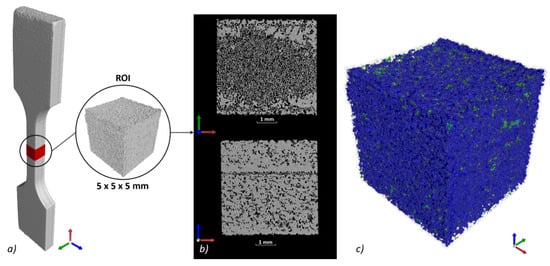 The cone-beam X-ray computed tomography system (XCT) v|tome|x m180/300 (GE Sensing and Inspection Technologies GmbH, Germany) was used for the reconstruction of the benchmark and tensile samples. Before the measurements, the geometry of the system was calibrated according to the GE procedure. An analysis of the geometric accuracy was performed for the benchmark samples, for which the following scanning parameters were used: tube voltage of 160 kV, tube current of 100 µA, integration time of a single projection of 1s, voxel size at the level of 60 µm. In turn, a porosity analysis was performed for the tensile samples using the following Computed Tomography (CT) measurement parameters: tube voltage of 80 kV, tube current of 70 µA, and a 200 ms integration time of a single projection. To obtain a higher resolution of the CT scans, the reconstruction was only performed for the selected region of interest (ROI), which was located in the middle of each sample. This allowed the reconstruction of the samples with a geometrical magnification of 32.35 and a resolution (voxel size) of 6.2 µm.