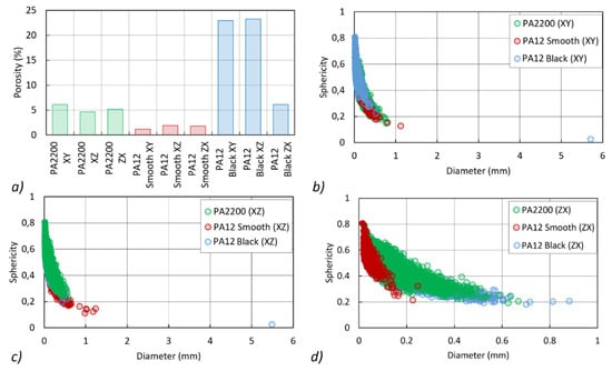 Porosity analysis: (a) dependency of sphericity and pore diameter related to the different building strategy, (b) XY, (c) XZ, (d) ZX.