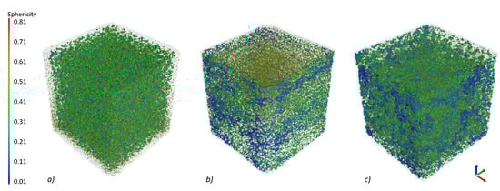 The highest porosity, exceeding 23%, was recorded for the PA12 Black XZ samples. The largest differences in porosity were observed for this series due to the build direction. For the PA12 Black ZX sample, the porosity was at the level of 6.1%. A comparison of the shape of pores (sphericity) and diameters for the analysed series is presented in Figure 10b–d. Open pores with diameters larger than 5 mm occur in PA12 Black XY and XZ samples. These pores have the most extensive structure (low sphericity) and occupy a significant part of the analysed volumes (Figure 10c). The differences between the shape of the pores occurring in samples built in the ZX plane are shown in Figure 12.