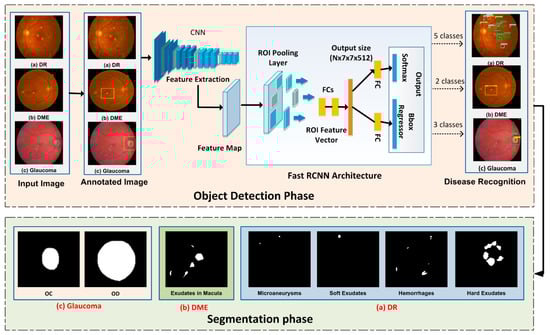 Our proposed method deals with the inadequate sample problem using unsupervised pre-training and supervised fine-tuning regions for localization. FRCNN is a single-stage training technique that classifies region proposals and refines their localization. In the test phase, FRCNN produces some class-independent region proposals of images and gets a fixed-size feature descriptor form each proposal using a CNN; afterward, the softmax layer classifies the regions accurately. Finally, FKM clustering precisely extracts the regions from localized regions. The proposed method detects the abnormalities of DR, DME, and Glaucoma regions simultaneously using FRCNN.