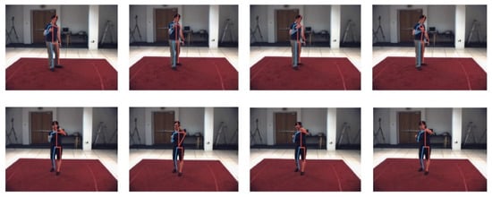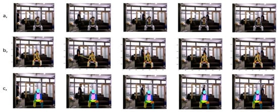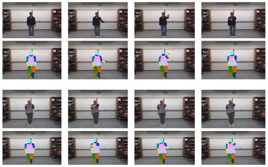 In existing methods, to overcome the challenges caused by the issue of background or viewpoint variations, gesture recognition is usually developed by combining multiple modalities of data inputs (such as skeleton joints information, human body shape, RGB, optical flow, and depth frames) with newly developed deep learning models [,,]. By utilizing skeleton joints information or depth information, gesture recognition performance has been significantly improved because they are helpful in the representation of gestures and played an important role in gesture identification. Although human skeleton joints and depth data can be collected directly from time-of-flight (ToF) cameras, gesture recognition on RGB video input is a substantial challenge because the human pose should be estimated with high accuracy. Skeleton joints convey vital information to represent gesture from the human pose, but it is not enough to identify complicated motions when it does not match to the shape of body parts correctly. For instance, if there are other actors present in the scene together with the main target, the action of other objects from the background can cause confusion to the correct extraction of the target person’s skeleton. Figure 1b shows possible errors in skeleton joints extraction of the main person due to the presence of other moving objects. However, when the body parts are segmented beforehand, the skeleton of a target can be obtained with much higher accuracy because the layout of the skeleton is restricted by the body part. Moreover, skeleton joints of the frame sequence of a video can be temporally incoherent due to independent errors in each frame as we illustrate in Figure 2; and this can cause incorrect classification.