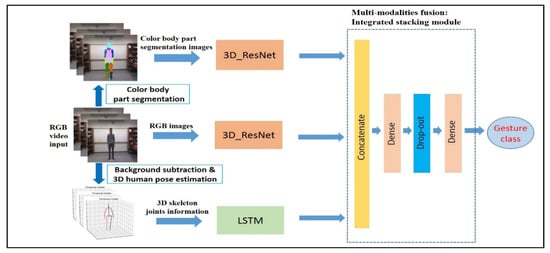 In this section, we present in detail our proposed approach for gesture recognition. The proposed method consisted of three submodels: two 3D_ ResNet networks and an LSTM network to deal with RGB frames, color body part segmentation images, and 3D skeleton joints information. These three submodels were effectively fused by integrated stacking module as a late fusion layer in order to decide the gesture class. We show an overview of the proposed algorithm in Figure 3.