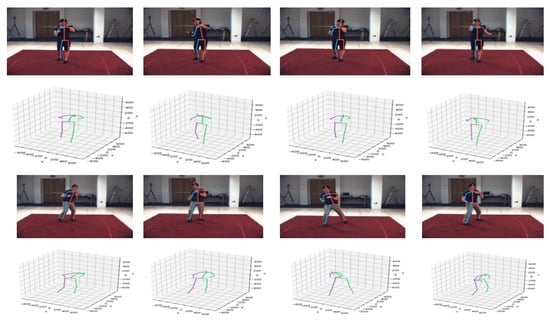 - Temporal video 3D human pose estimation: We extracted 3D joints skeleton information for gesture recognition from temporal video 3D human pose estimation called Pose_3D [] from background subtracted RGB images. The Pose_3D network is a sequence-to-sequence network that predicts a sequence of temporally consistent 3D human pose from the sequence of 2D human poses. The 2D human pose was obtained by the state-of-art 2D human pose estimation framework—the stacked-hourglass network [] trained on the Human3.6M dataset []. The decoder of the Pose_3D consists of LSTM units and residual connection to predict temporally consistent 3D poses of the current frame using the 3D poses of previous frames and 2D joints information of all frames, which were taken from the final state of the encoder. The temporal smoothness constraint was imposed on the 3D pose extraction of a video. Since the stacked-hourglass network was used for 2D pose estimation on individual frames, this constraint made the predicted 3D poses more stable and reliable even with 2D pose estimation failure in a few frames within the temporal window. Figure 5 shows the example of temporal 3D skeleton joints of video frames extracted by the Pose_3D network.