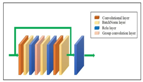 The overview of ResNet blocks. It consists of two convolution layers (1 × 1 × 1 kernel size), one group convolution layer (3 × 3 × 3 kernel size), and three batch normalization (BatchNorm) layers and rectified-linear unit (ReLu) layers.