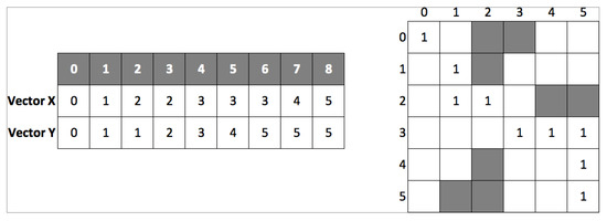 The initial solution used by the SA algorithm is created using the cumulative penalty costs matrix, where indices correspond with the point coordinates. The rectangular mesh is generated using the universal transversal Mercator (UTM) system. A greedy uninformed search procedure is used to create the initial solution encoded by two integer-valued vectors containing the coordinates of the nodes being part of the route. Figure 1 shows a candidate solution representing a path between (0,0) and (5,5) points.