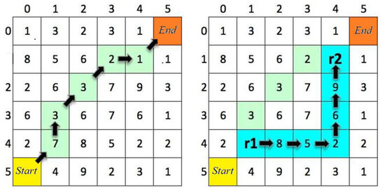Since these paths are not sharing a common point, the second criterion is applied to create an alternative solution. First, the nearest points to r2 are identified, and a path between them is generated using the A* algorithm. Figure 5 shows the resulting alternative solution s’, where (2,2) in the current solution and (2,4) in the pseudo-random path are the nearest points to r2.