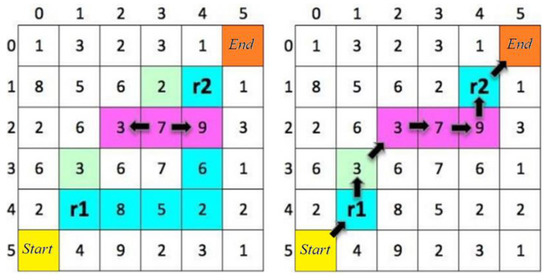 Two conditions must be considered to avoid repeated movements, considered as tabu movements in the pseudo-random paths. The first one verifies if a common point exists between s and the generated pseudo-random path. If this point exists, s’ is created by merging s with the pseudo-random path using this common point (Figure 2). The second condition is applied if the paths are not sharing a common point. To merge the two nodes closest to the r2 point having the least distance between them are searched for to be connected through the A* heuristic [52] (Figure 3).