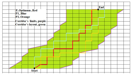 Figure 6 shows an example of a corridor in green color with limits in purple color. The shortest route P is shown in red color and the route P1 obtained by the SA algorithm is shown in blue color. This route is feasible since it is contained in the corridor, complying with the mathematical model’s constraint (4). The route P2 (in orange color) is infeasible since part of it is outside the corridor, and the perturbation solution (s, ptam) function is used to repair it.