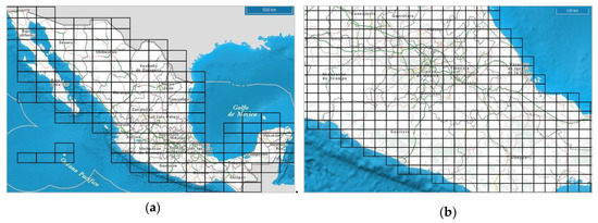 Three realistic scenarios with different dimensions are tested in the proposed approach. The geographic information is provided by the National Institute of Statistics and Geography of Mexico (INEGI). INEGI organizes the information of Mexico according to map scales. The digital elevation model (DEM) and topography are used to generate the cumulative cost matrix. Figure 7 shows the organization in topographic charts of the Mexican regions at two scales (1:250,000 and 1:50,000). The 1:50,000 map scale is considered to calculate the distance of the nodes sequence p, in kilometers (km), as follows: