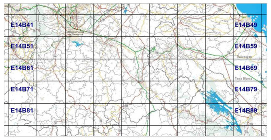 Figure 8 shows the names of the topographic charts of the Mexican territory used in this experimental study, which corresponds to the geographic information for the year 2015. The first test problem is a small network of 586 × 732 nodes covering the Mexican port of Veracruz. The second one consists of a medium-sized network of 585 × 1467 nodes, including the Joachín and Naranjos cities, both in Veracruz state, México. Finally, the third problem is an extensive network of 5341 × 6727 nodes comprising part of the Mexican states of Morelos, Guerrero, Puebla, and Veracruz.
