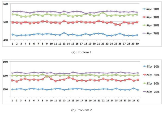 Figure 10 shows the behavior of the objective function concerning the size of the neighborhood structure: Figure 10a is for problem one, and Figure 10b is for problem 2.