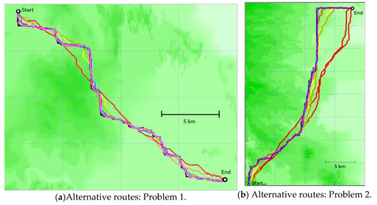 According to [6], locating an optimal corridor is analogous to identifying the shortest or least expensive path between two points. Traditional approaches generate a set of alternative routes using enumerative methods with penalty techniques or by specifying one or multiple intermediate points where the path must pass [7,8,9]. The running time of these methods tends to grow exponentially, depending on the size of the geographical study area. In addition, the generation of near-optimal alternative routes in reasonable times using exact methods is hard since they find only one solution in their searching process [10].
