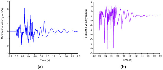 Nine measurement points were arranged to monitor blast-induced vibration data in longitudinal, tangential, and vertical directions, as shown in Figure 2. On-site monitoring data of blast-induced vibration are shown in Figure 6.