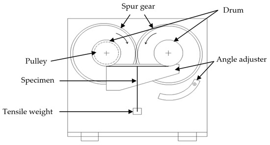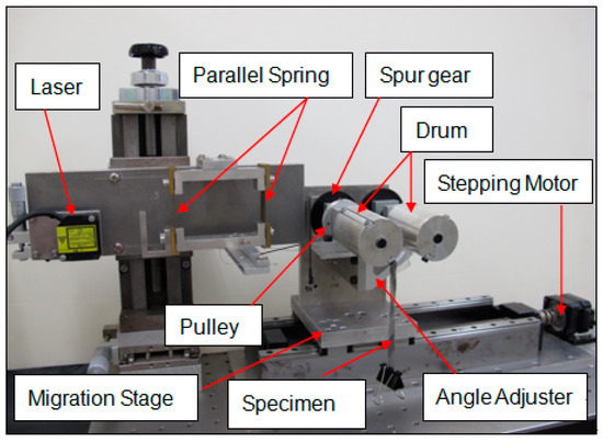 The drum rotates by the spur gear according to the peel speed as a string is attached at a fixed point and tied on the drum’s pulley as shown in Figure 3 schematic diagram. As the drum rotates according to the peel speed, the migration stage is being moved back and forth to the initial state. Angle adjuster is used to change the peel angle according to several setting from 0° to 180°. The flexible film adhesive is attached to the drum. A weight (paper clip) was fixed on the free end of the film to keep the specimen in T-shape. The drum rotates according to peel speed as a string is attached at a fixed point and tied on the drum’s pulley. Peel speed and peeling distance can be changed according to apparatus specifications. A parallel spring is pulled by pulley wire along the peeling process. Three spring thicknesses were used for this study: 0.3 mm, 0.4 mm, and 0.5 mm. During the peeling process, displacement is triggered by a parallel spring caused by peel strength and detected by a laser sensor. This apparatus can obtain a wide range of peel strength measurements by changing the spring thickness.