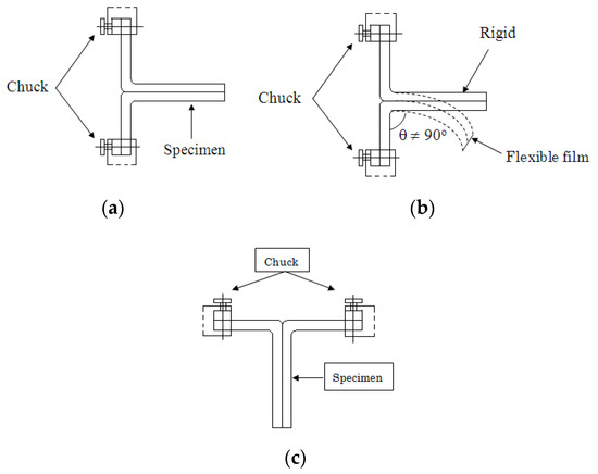 (a) Standardized T-peel test method Japanese Industrial Standard (JIS) [27] and American Society of Testing and Materials (ASTM) [28] and (b) Failure of flexible film specimen to stabilize the peel angle, (c) the new testing apparatus for T-peel test as shown in Figure 1.