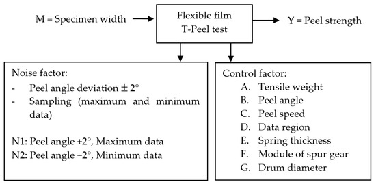 Parameter diagram or P-diagram is constructed to understand all parameters involved in a system as shown in Figure 5. The function of Al-CPP T-peel test is to measure adhesion peel strength in flexible film. Thus, the response or output of T-peel test is peel strength, which is measured in Newton (N). The input of T-peel test is known as signal factor. In the ideal function, the energy transformation occurs for three different specimen widths that are 5 mm, 10 mm, and 15 mm. Signal factor, in this study, is specimen width that is a controllable variable to actualize the intention (variation in peel strength) to achieve robust condition regardless of various width condition [26].
